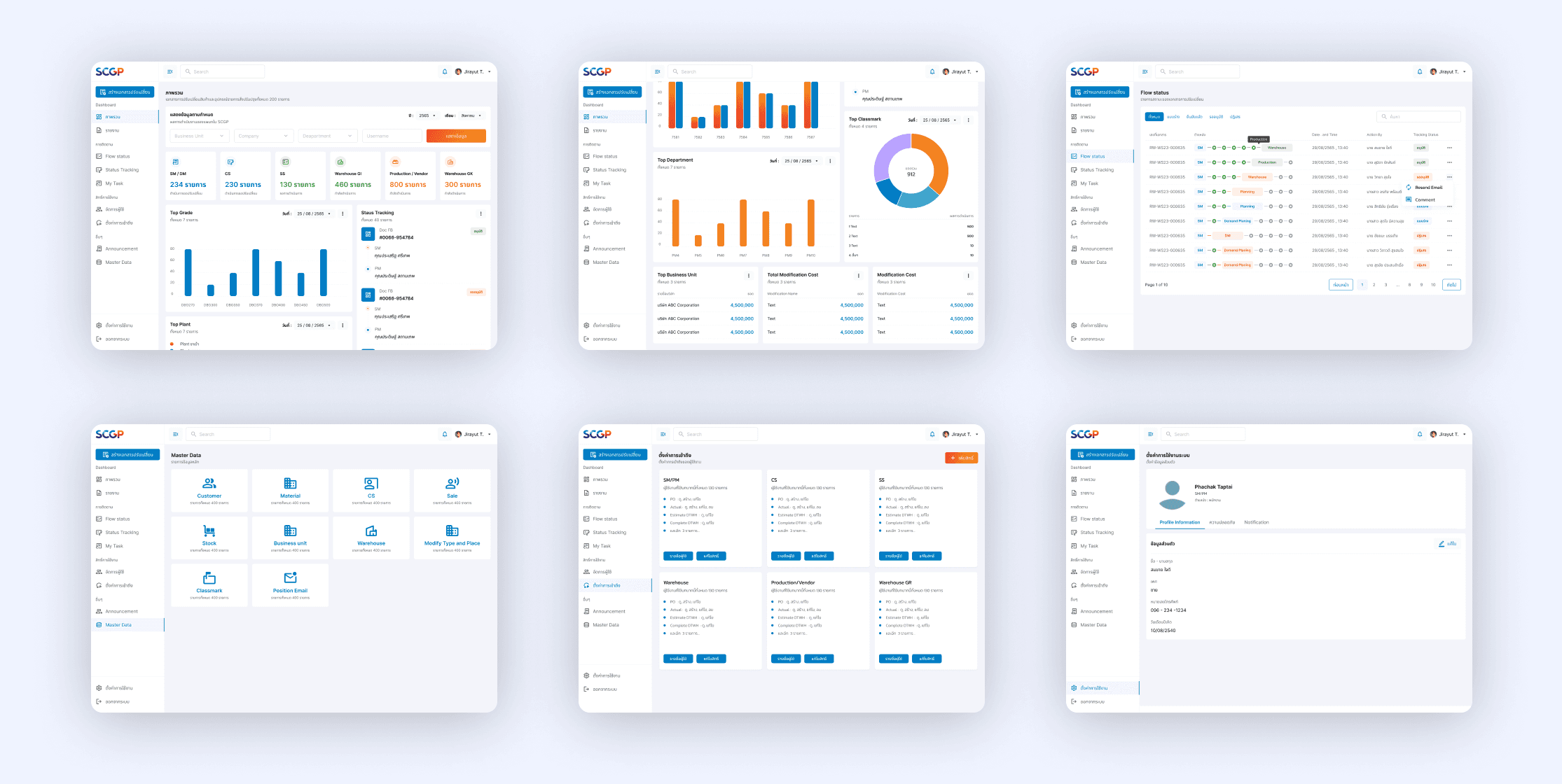 This enterprise web application for SCGP was designed to manage internal documents and workflows across departments. It supports real-time tracking of document flows, shipment processes, and approval statuses. The system includes customizable dashboards, centralized master data management, and advanced user management for role-based access control.